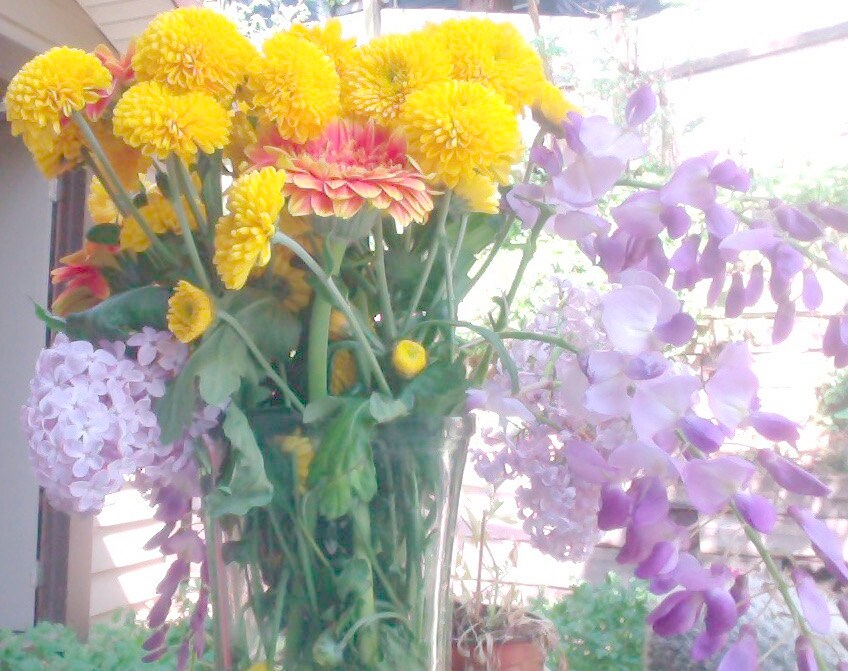 I have added lilacs and wisteria branches to our last week bouquet for today's Mothers day