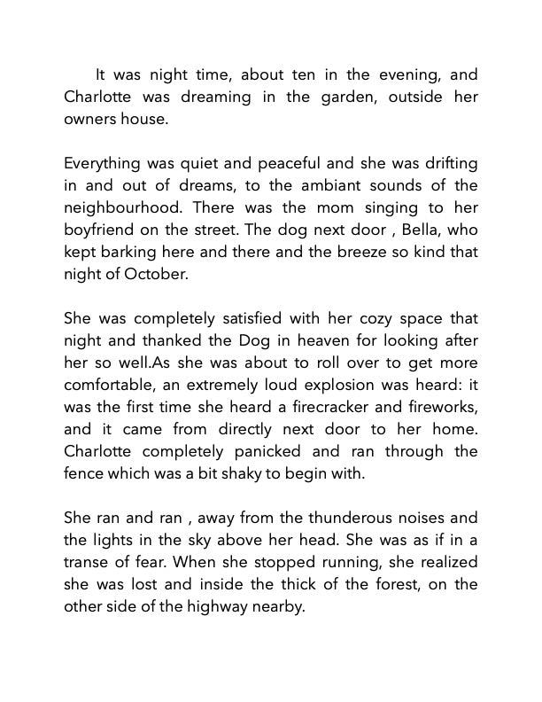 A mysterious story with a lingering sad ending. Charlotte was called Squeak, in one other story written in september 2025, I think. Squeak was her old rescue dog name from the pound. She squeaks all the time when she yawns. Charlotte is her name with us and she kept it in this second story about her. Fiction of course! :)