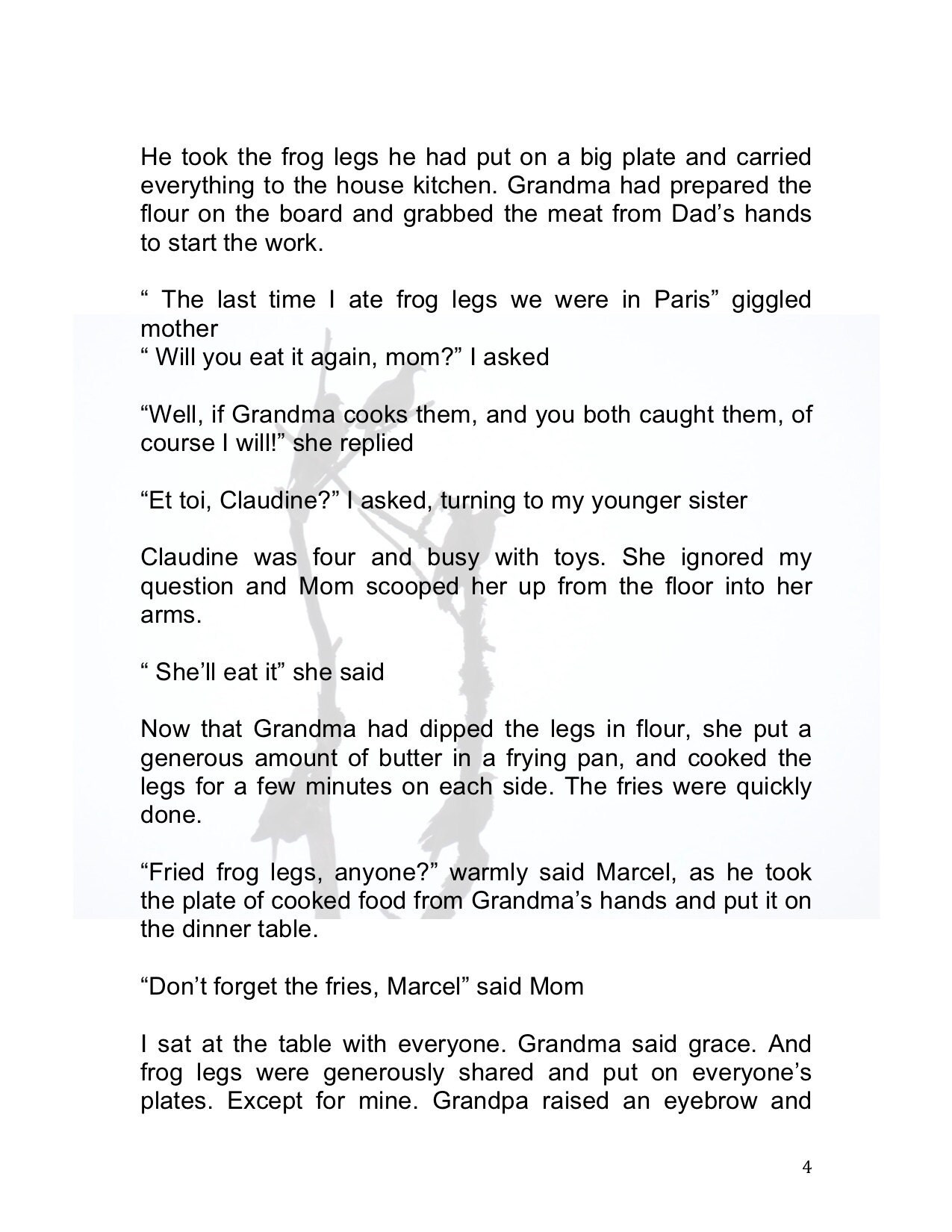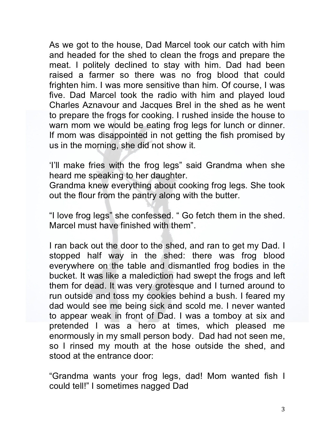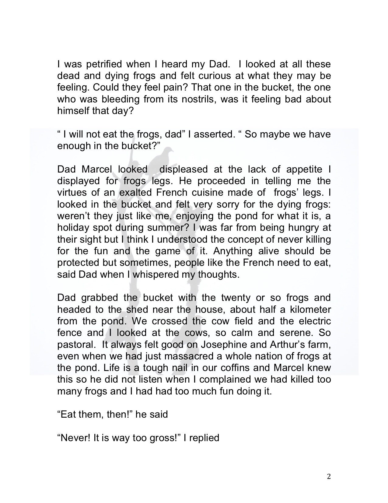 It is 1:00am. This heat is terrible for sleeping schedule. I never seem to want to go to bed. I have reworked the text in the last hour and I like it an itsy tiny bit better. I dont want it to come out as preachy, which is hard for a vegetarian story. I am off to bed.