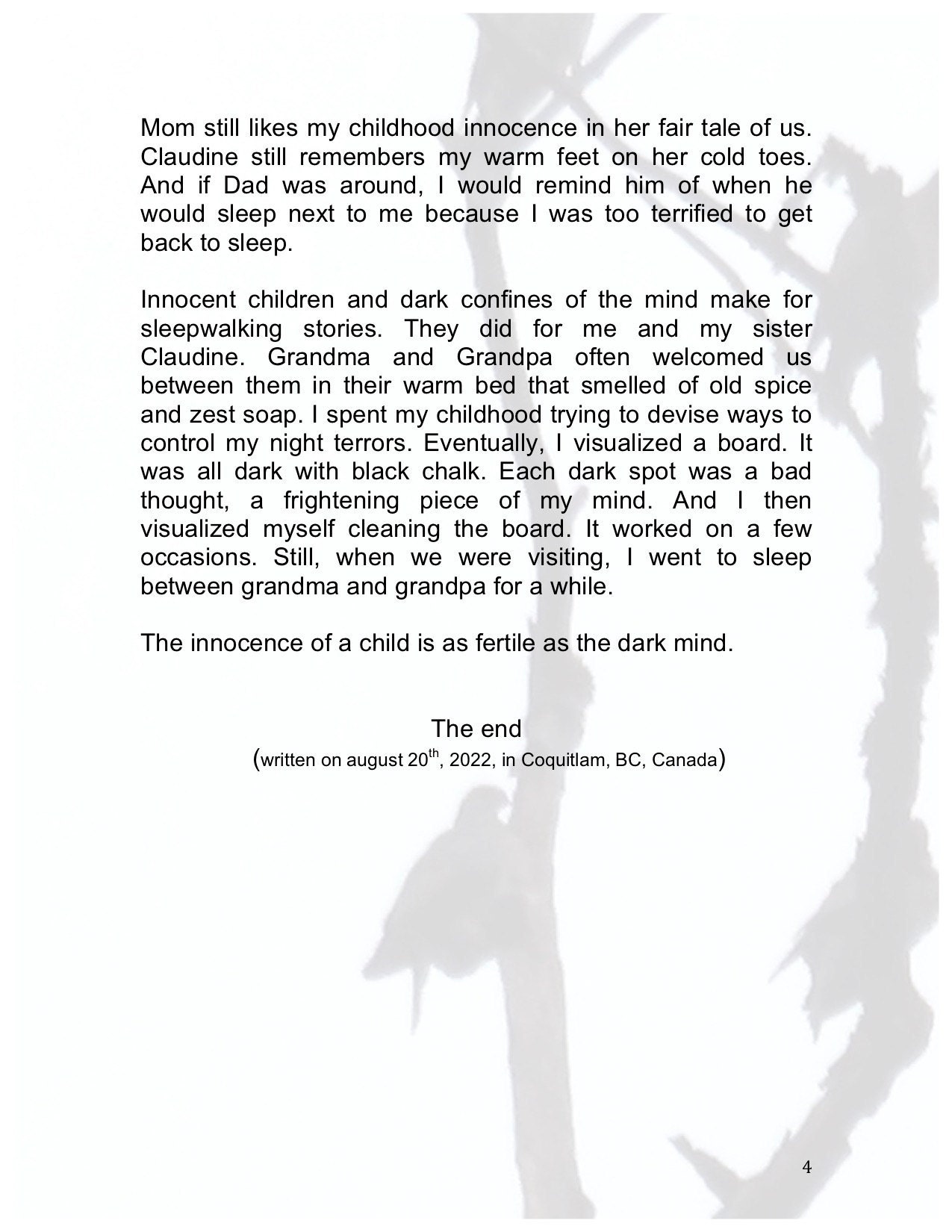 It is now 3am and I have just posted this above and latest version of the fifth, harsher, story of family fiction and truth. It is allright but was written in less than 2 hours. It will need to be reworked.