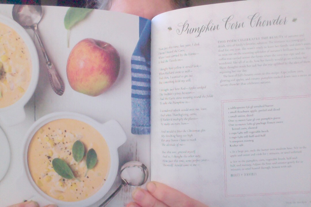 I got the book today, for my birthday last month. We tried the pumpkin and corn chowder tonight, truly an autumn recipe though. It is good. it has an apple, pumpkin puree, onions diced, frozen corn kennels, nutmeg, two cup of half half and two cups of broth. It takes 20 minutes to make and cook. Nice truly. i made goat cheese crostini with that. The book is covered in poetry too, not just recipes and biographical info. it is a true gem that book. I am very happy I asked for it for my 47th.