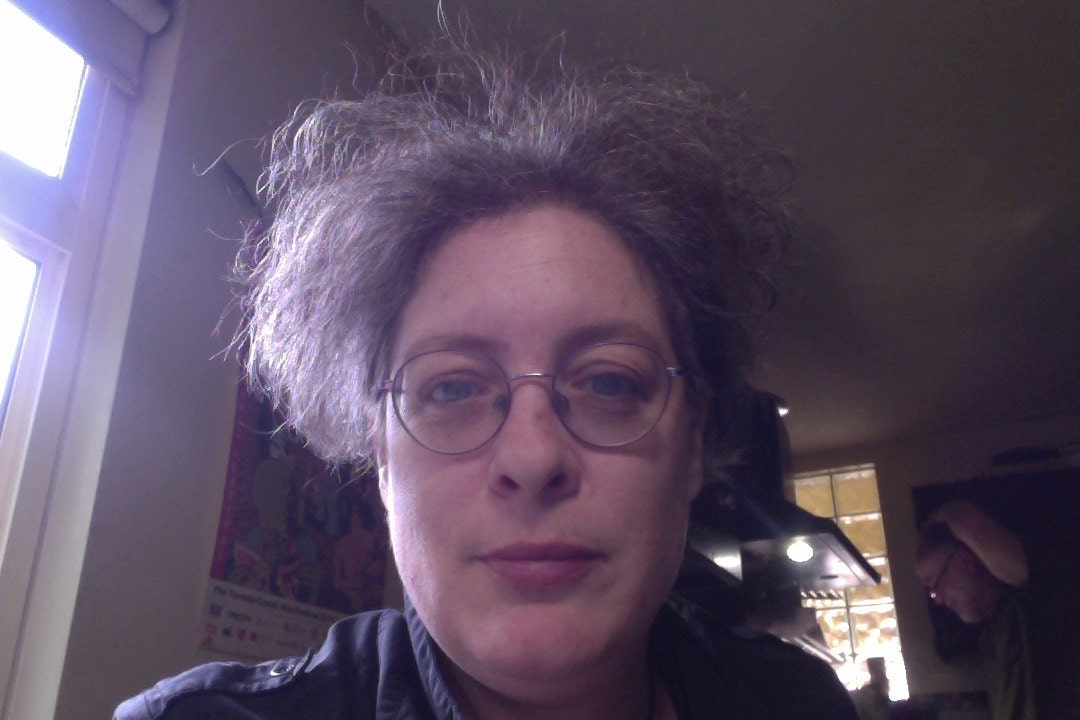 I may have a bed head and still have yet to brush my hair, but this fun photo shows hubby cooking his poached egg at the back.