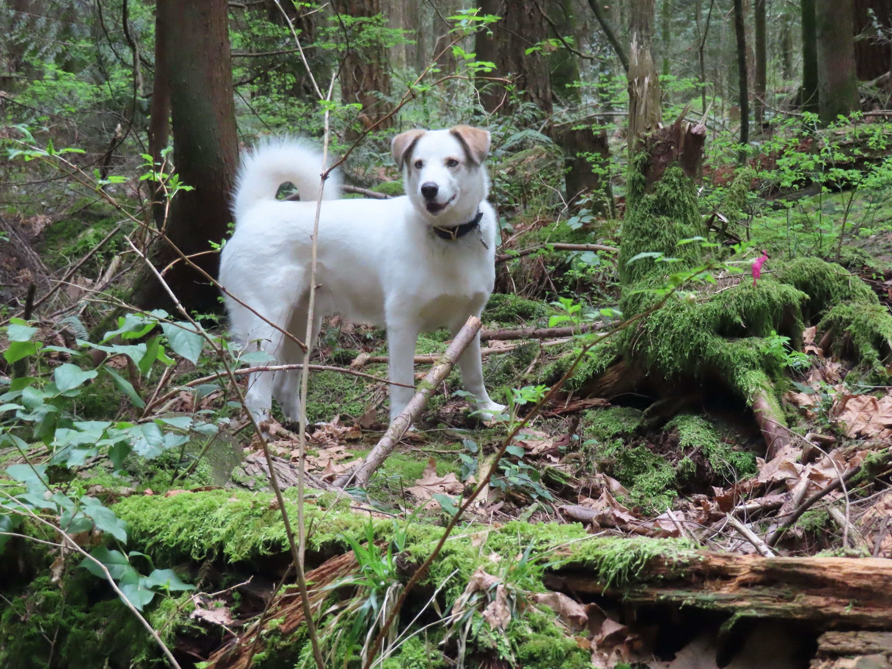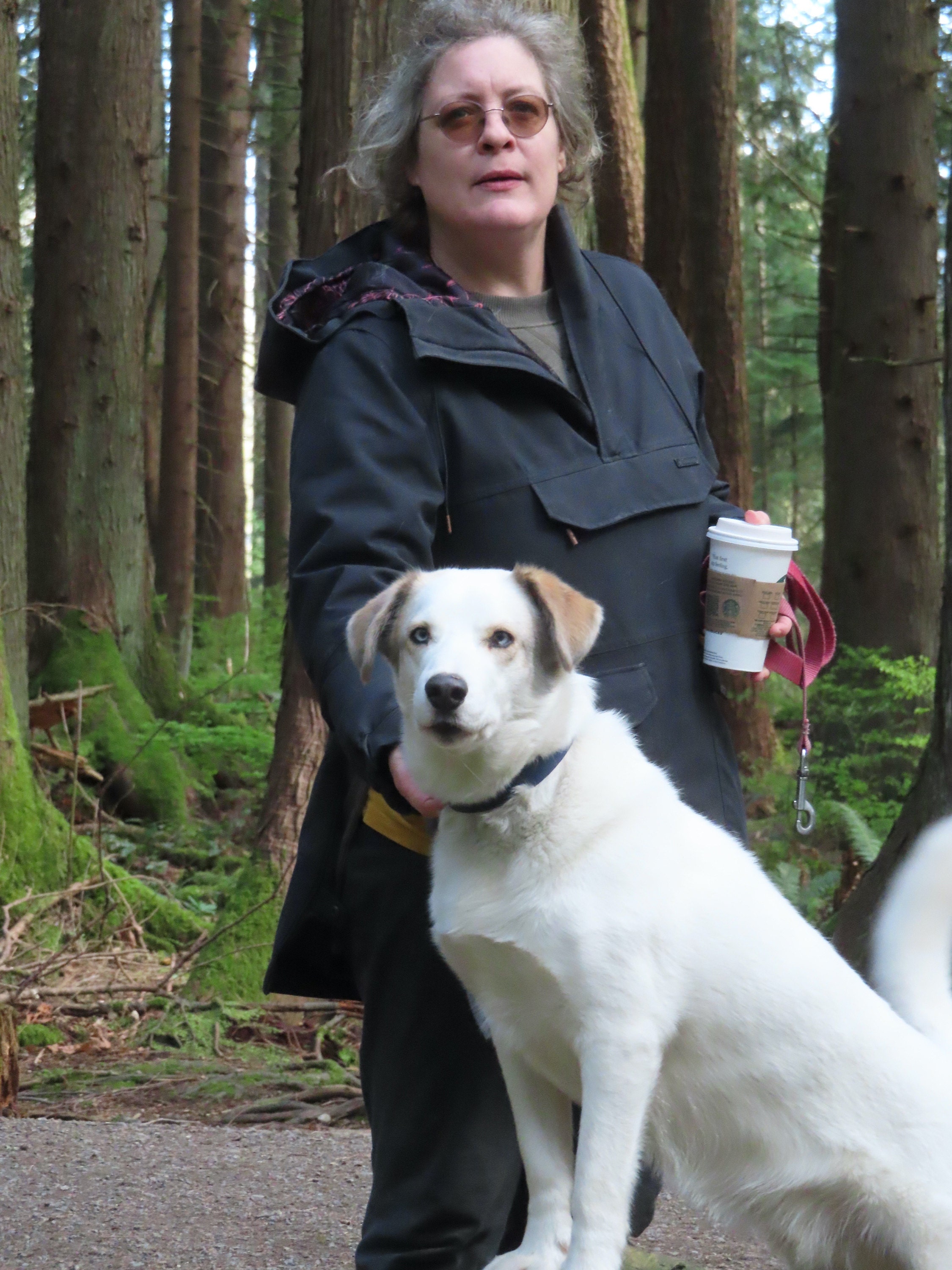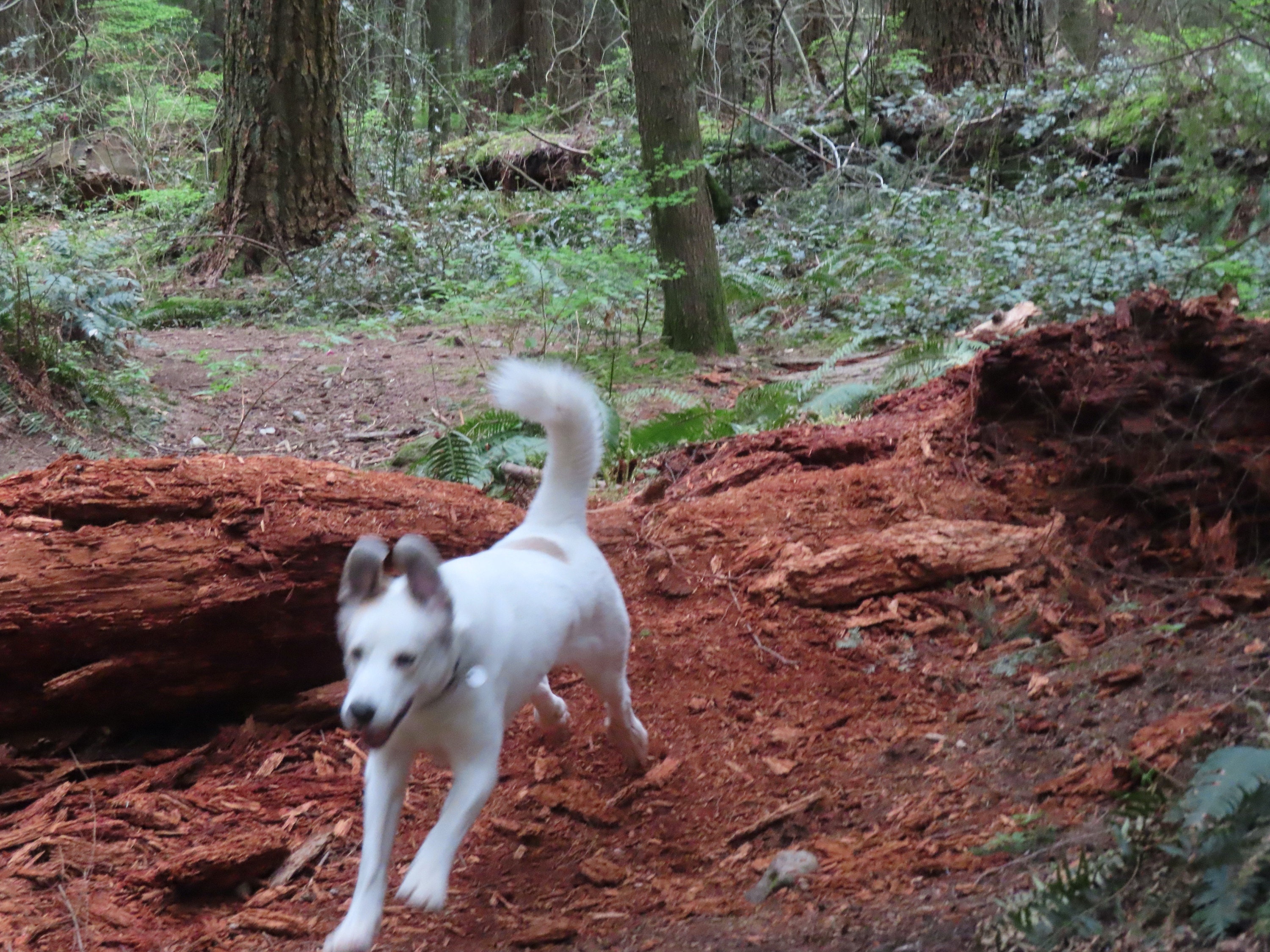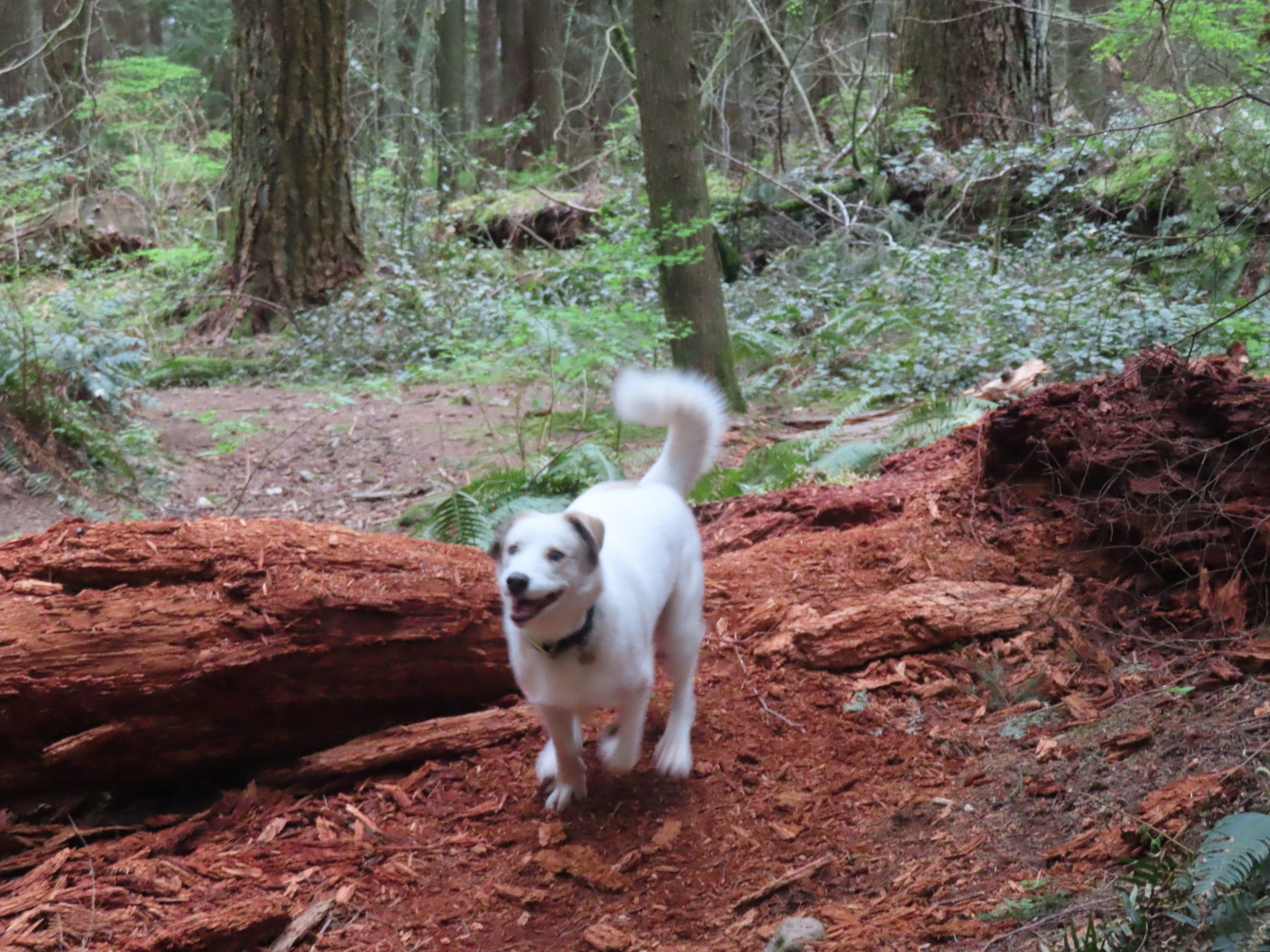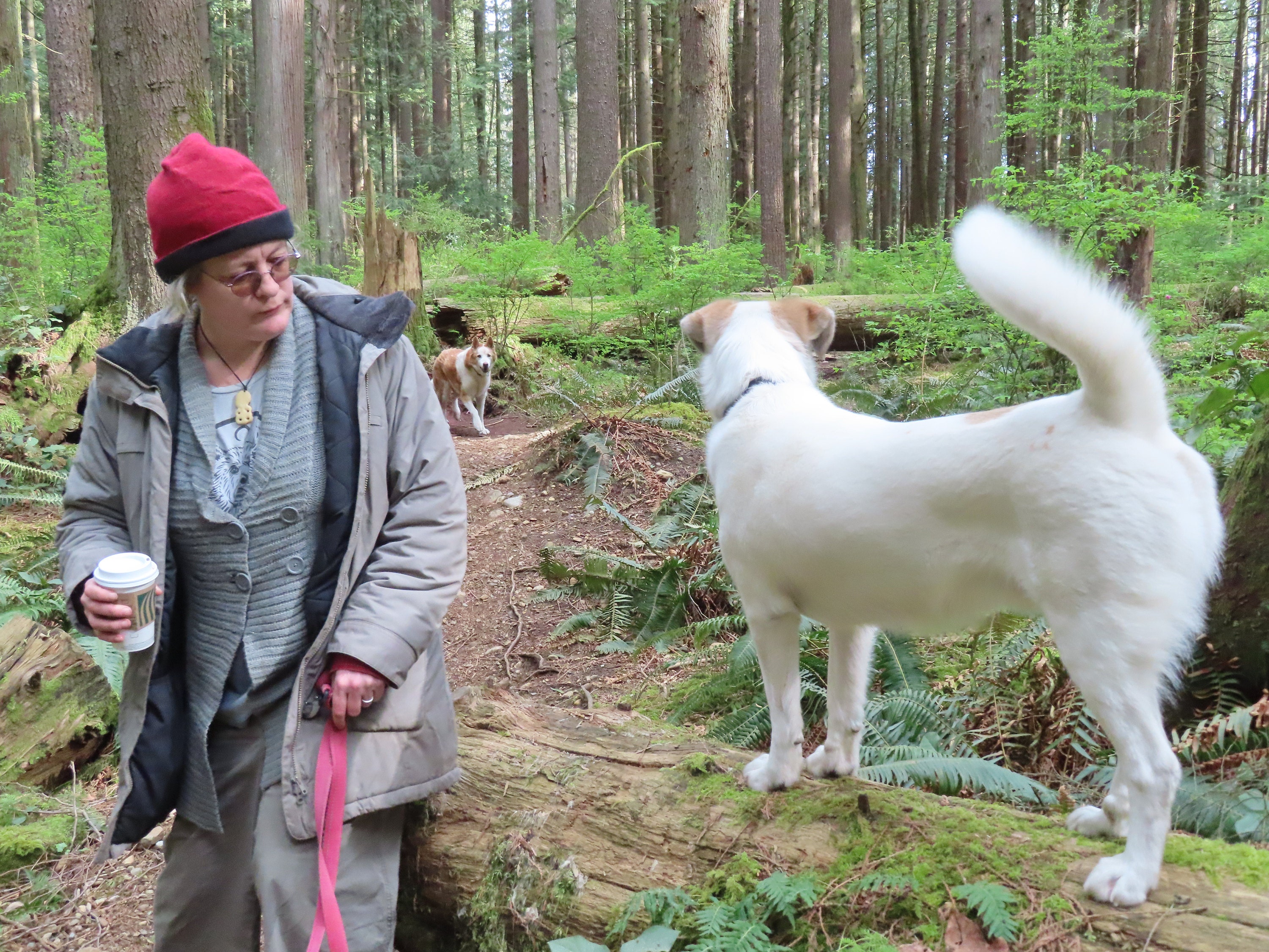 On a wooded trail, by community path trail, I think. Many logs to sit on and let the dogs fuss and sniff and dig and play in the forest.