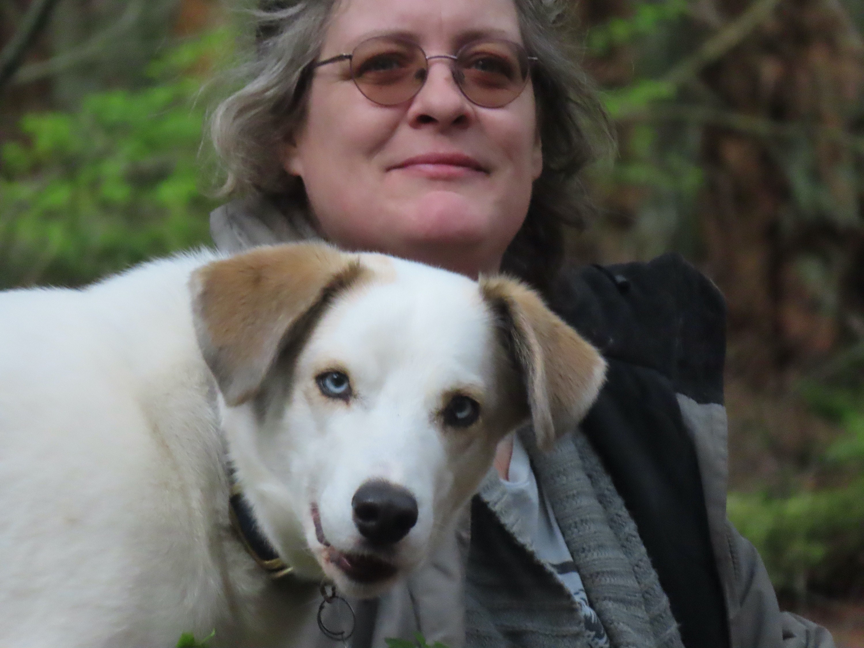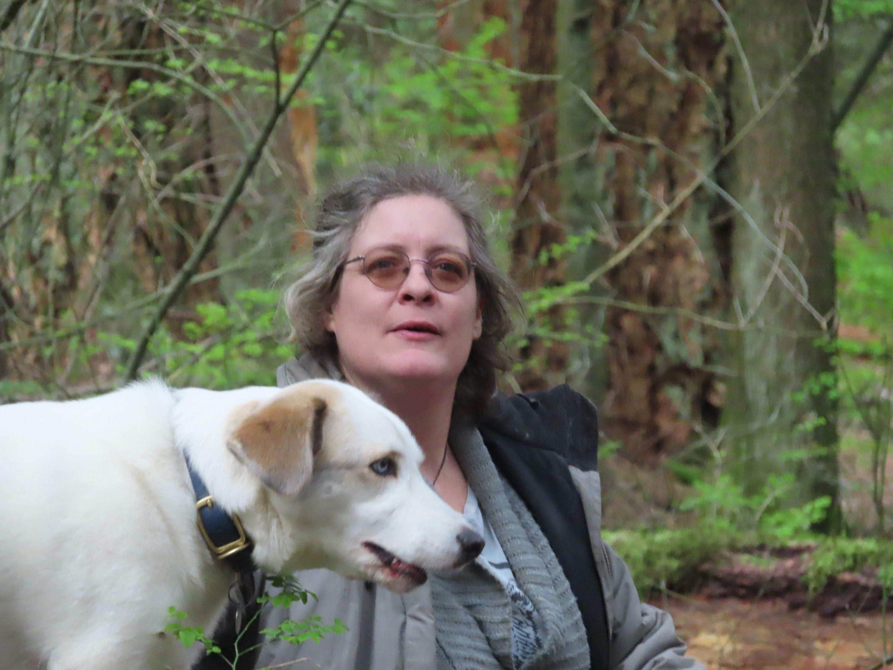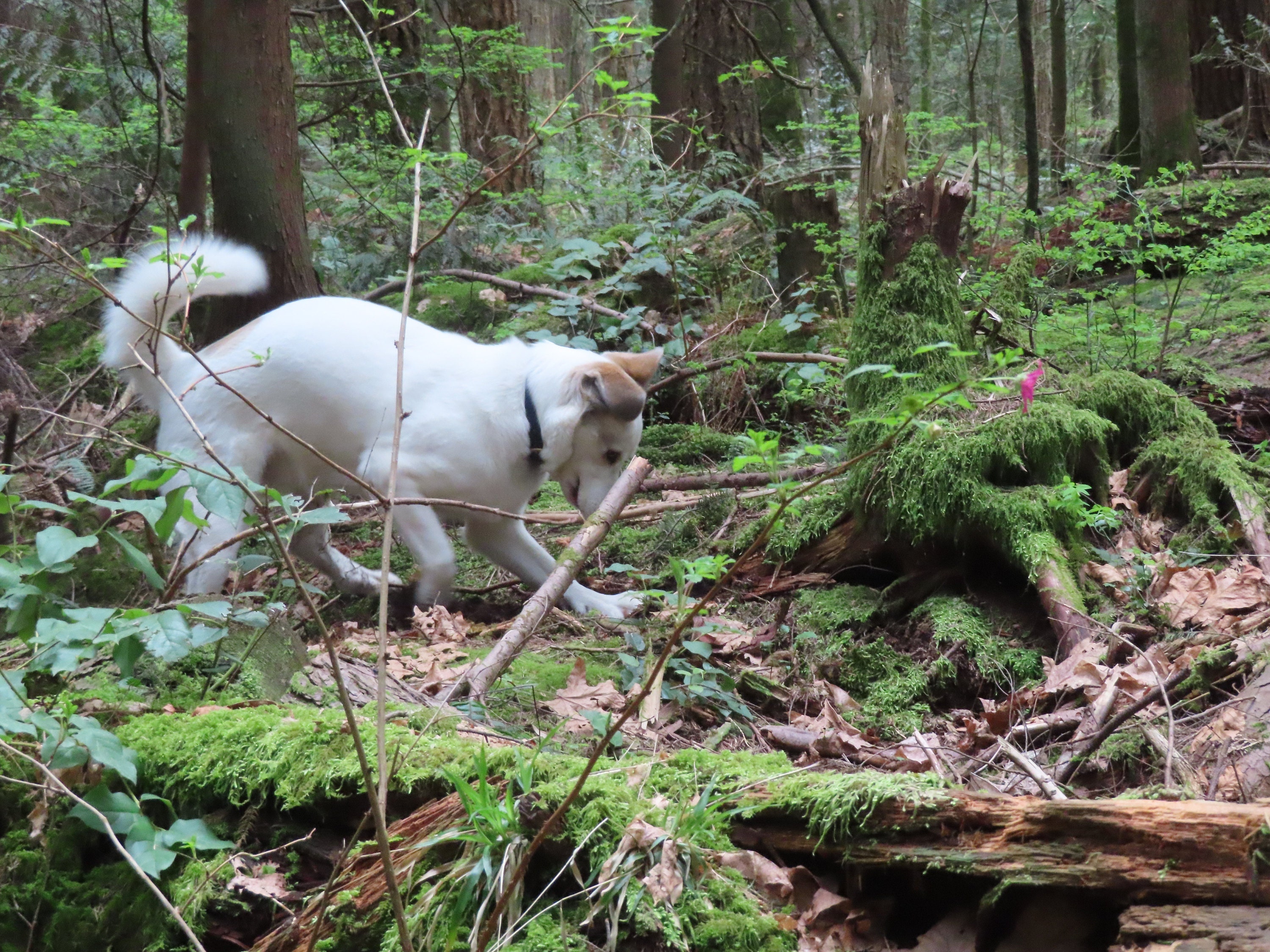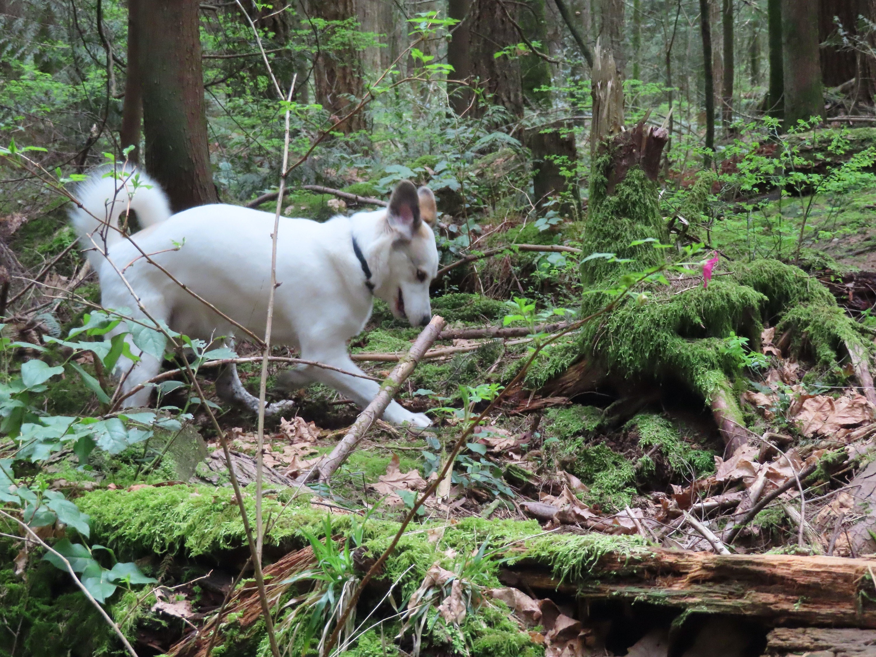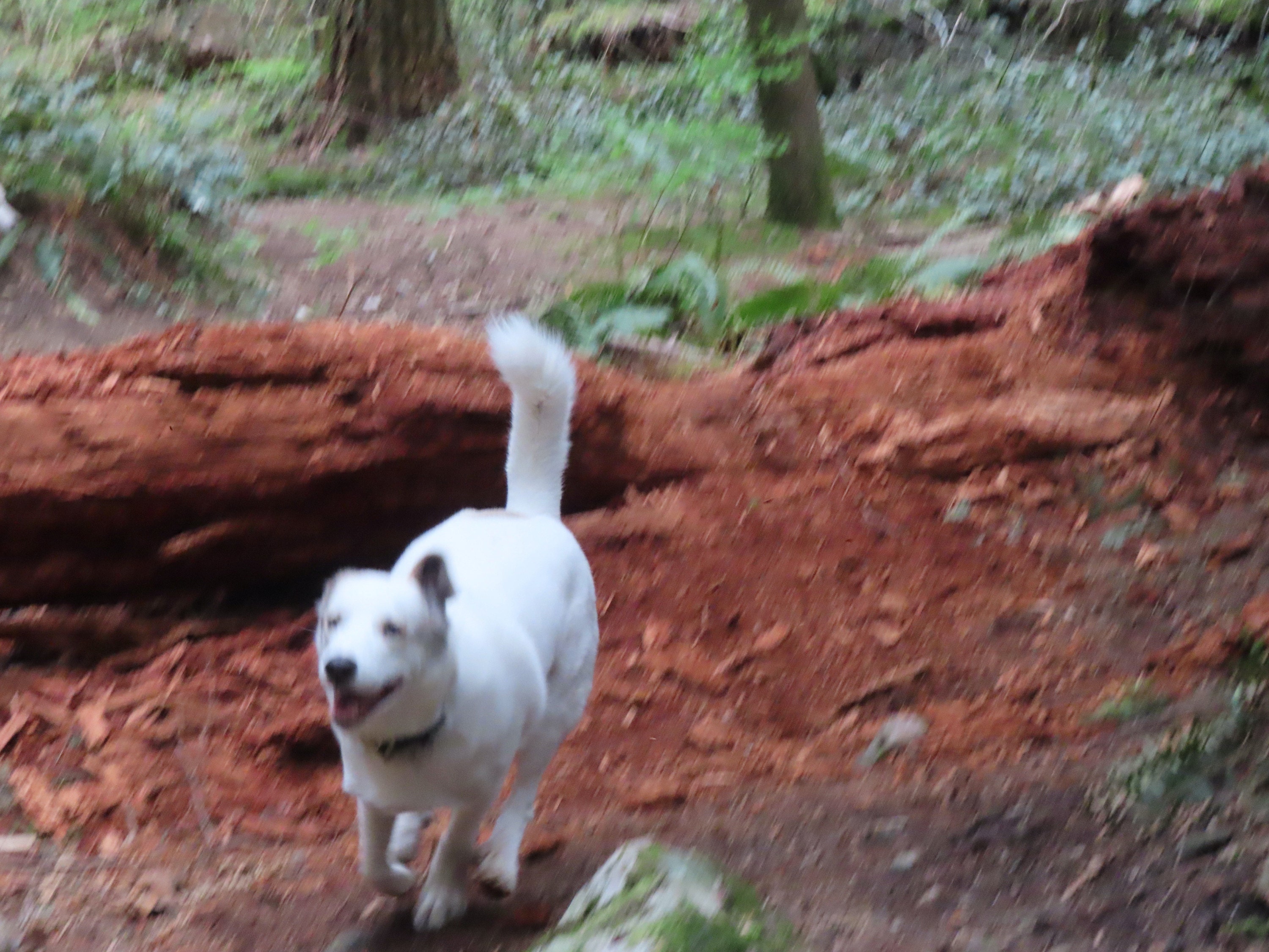 On a wooded trail, by community path trail, I think. Many logs to sit on and let the dogs fuss and sniff and dig and play in the forest.