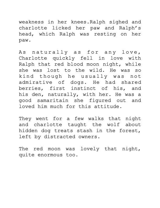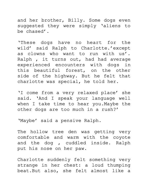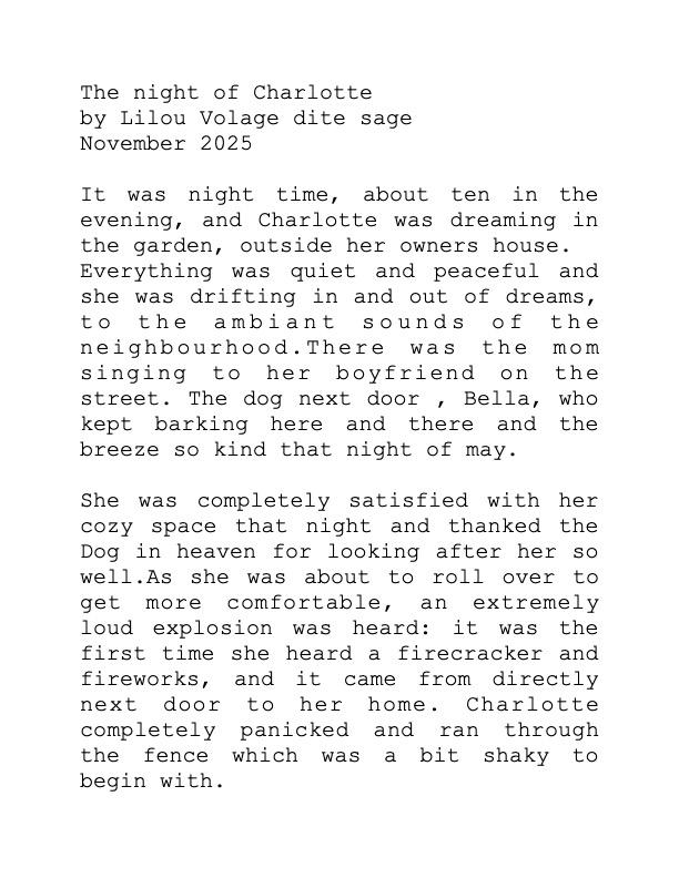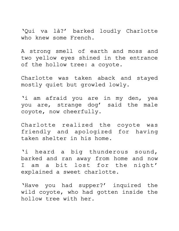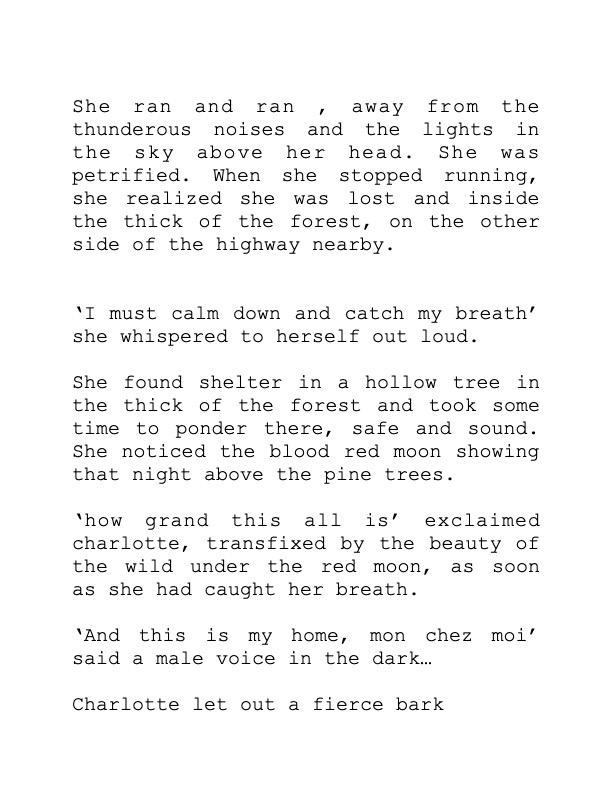 If it was not a dream, it would end with Charlotte returning to her domestic life at home with her humans after an escape one night to the forest nearby,on the other side of the highway.
