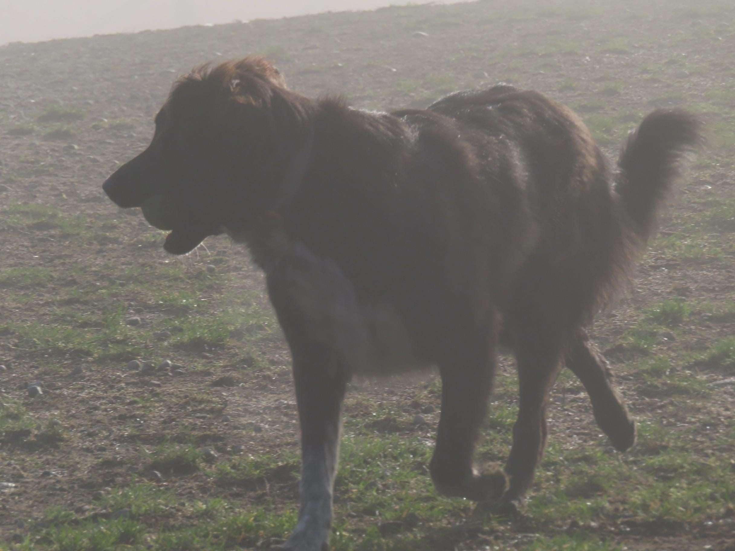 Photo; Charlotte, January 2026, in the foggy dog park with ball