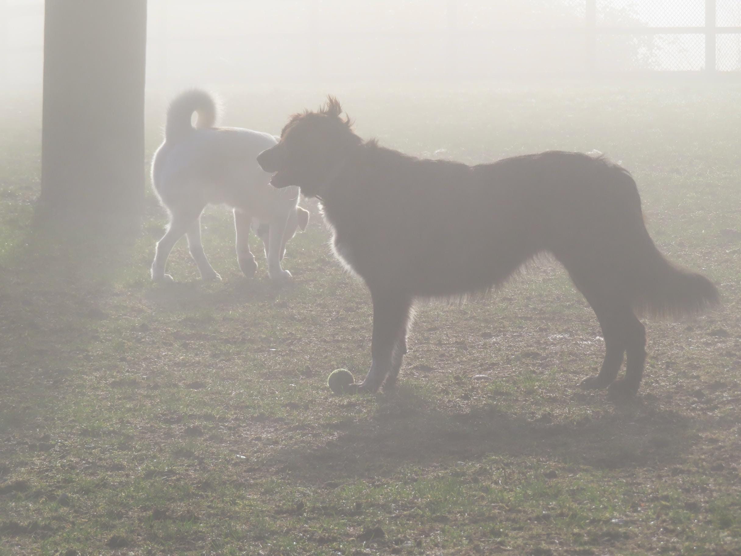 Photo: By hubby, our two mutts in the heavy fog, some jan or feb 2026 morning, at the dog park.