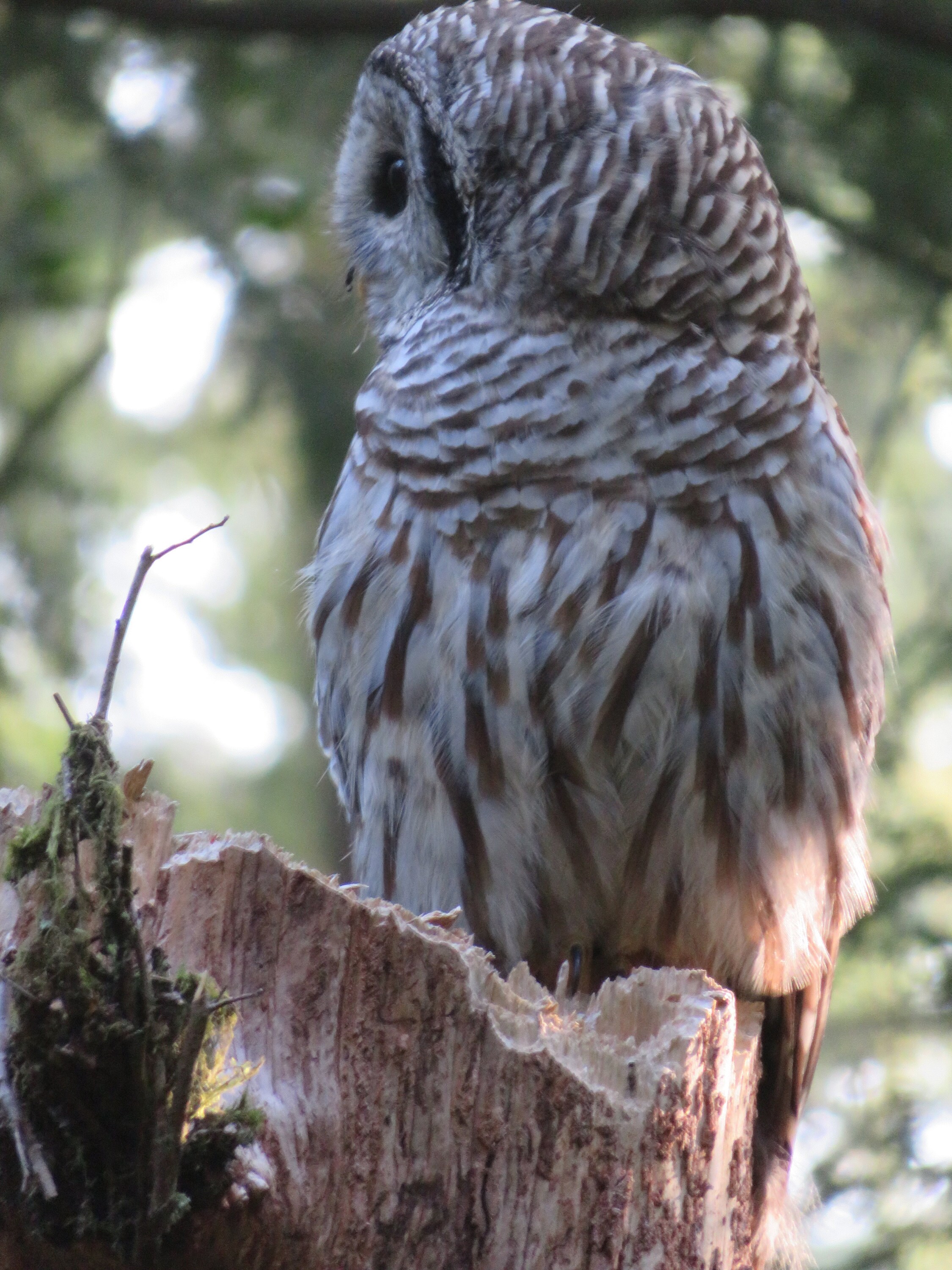 Les barred owls (chouettes comme celle ci en photo), sont en fait une espece non originaire du BC. Mais ce sont bien les seules chouettes visibles en foret autour d'ici. Meme si elles sont fort discretes depuis un an ou deux.