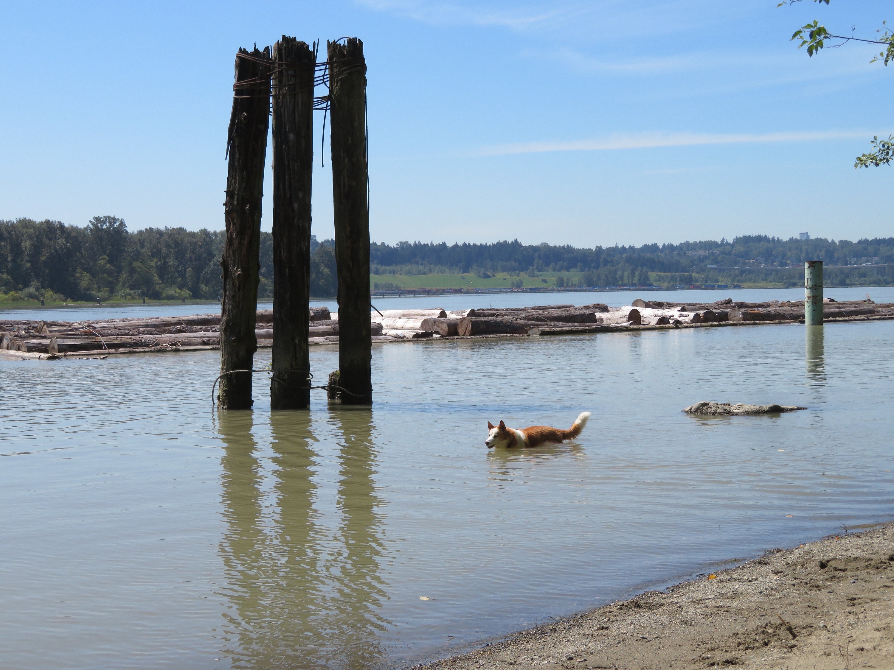 Whiskey nage dans les eaux St Laurent depuis belle lurette. On croit tous qu'il est un humain. La plage , les piliers, les pitounes: c'est bien le fleuve sans bouche, en poesie canine d'eau douce a la whiskey.